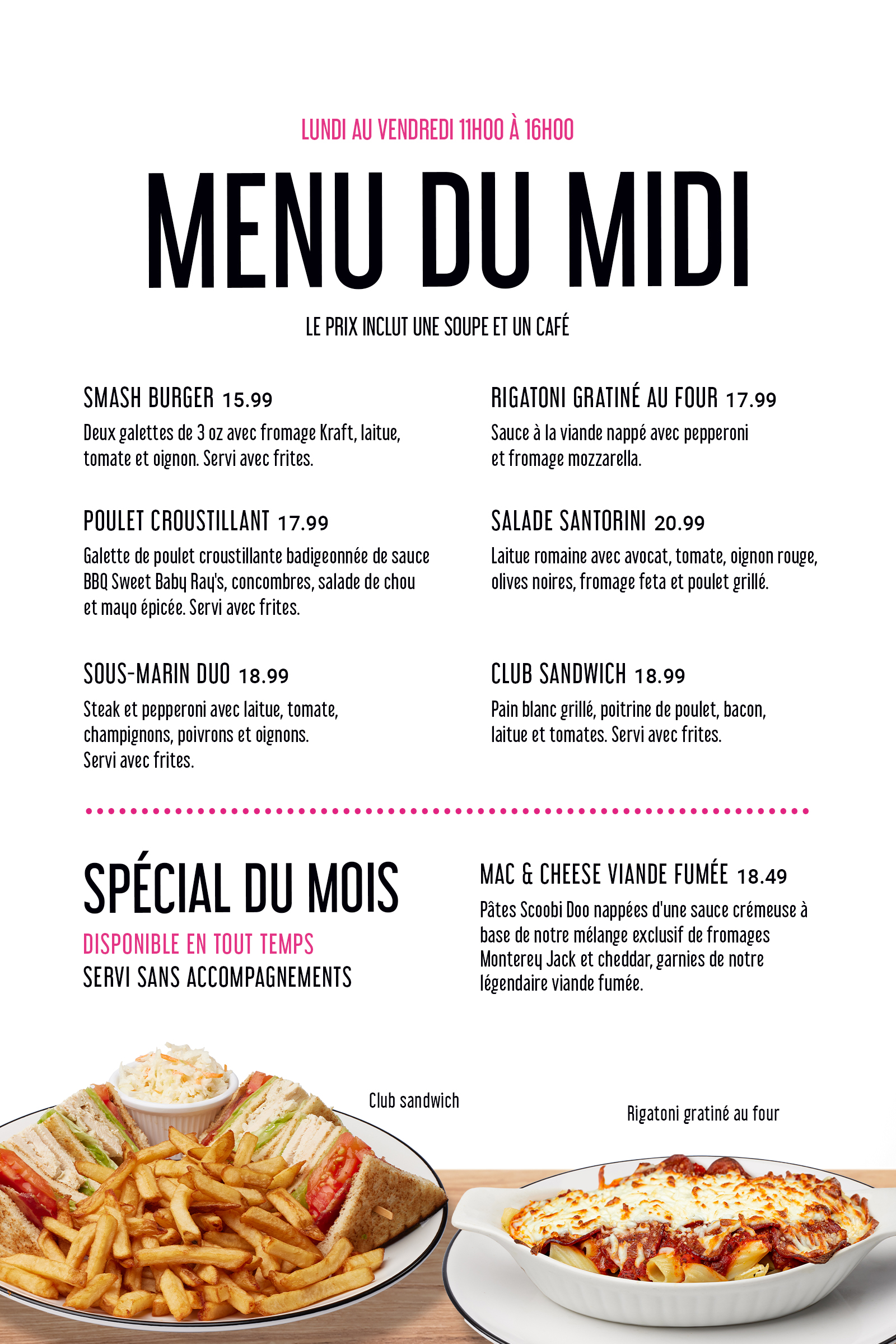 Que vous ayez envie d’un brunch copieux, d’un lunch savoureux ou d’un dessert gourmand, notre menu a de quoi satisfaire toutes les envies. Parcourez nos sélections dans un format d’onglets facile à naviguer, y compris nos Offres à Durée Limitée—mettant en vedette des favoris de saison et des plats exclusifs à ne pas manquer. Régalez-vous et découvrez votre prochain coup de cœur chez Nickels!